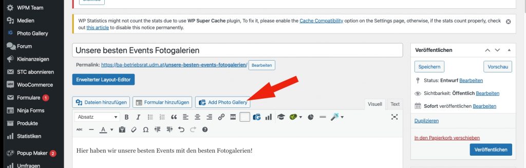 —> Um eine Galeriegruppe in einen Artikel bzw. in eine Seite einzufügen, geht man auf die Bearbeitung des betreffenden Artikels bzw. der betreffenden Seite; dort wählt man durch Klick eine Position, wo die Gallery Group eingefügt werden soll und klickt dann auf ‚Add Photo Gallery‘