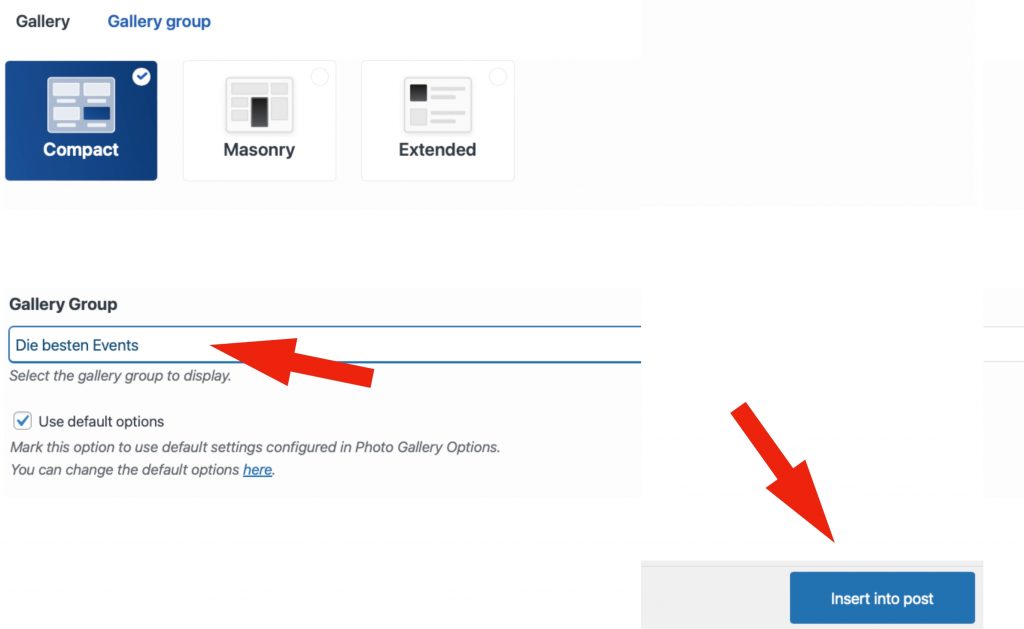 —> Nun wählt man die gewünschte Gallery Group aus und klickt auf ‚Insert into post‘