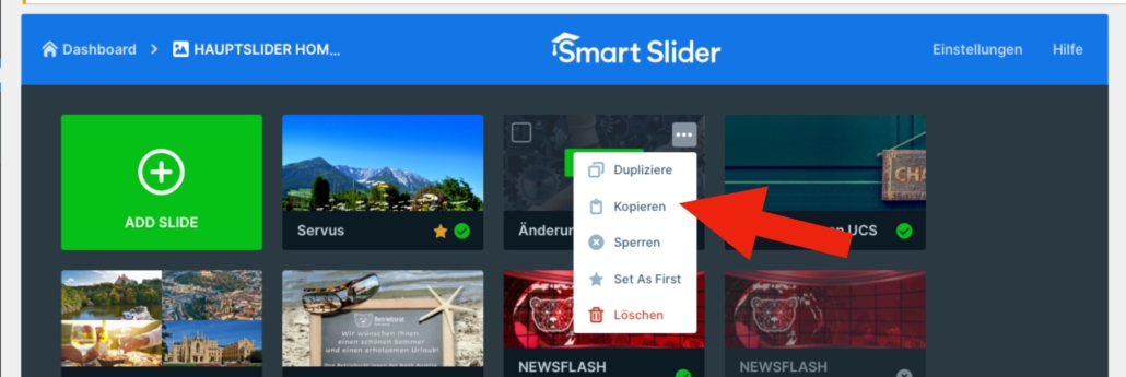 —> Im Dashboard des betreffenden Sliders auf die zu kopierende Slide gehen und das 3-Punkte-Menu anklicken