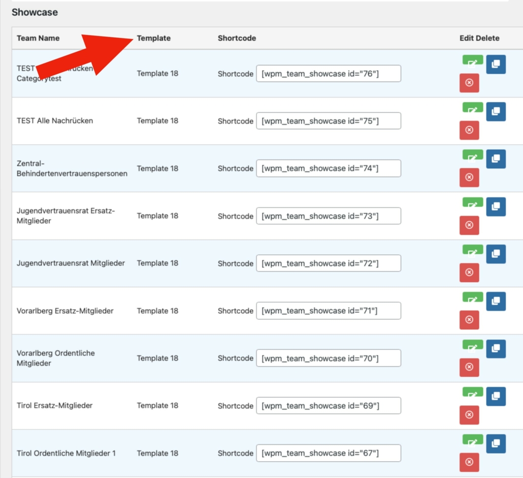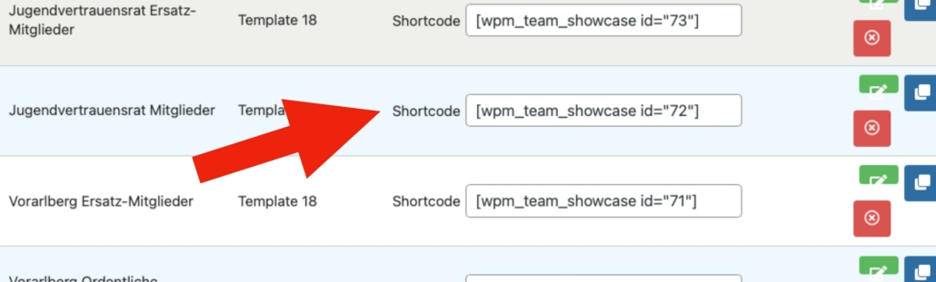 Jedes der Teams erhält vom System automatisch einen eigenen Shortcode, etwa ‚[wpm_team_showcase id=“32″]‘. Dieser Shortcode wird dann auf der jeweiligen Seite eingefügt, wodurch das Team dann in der jeweiligen Zusammensetzung dort im Stil des Template 18 erscheint.