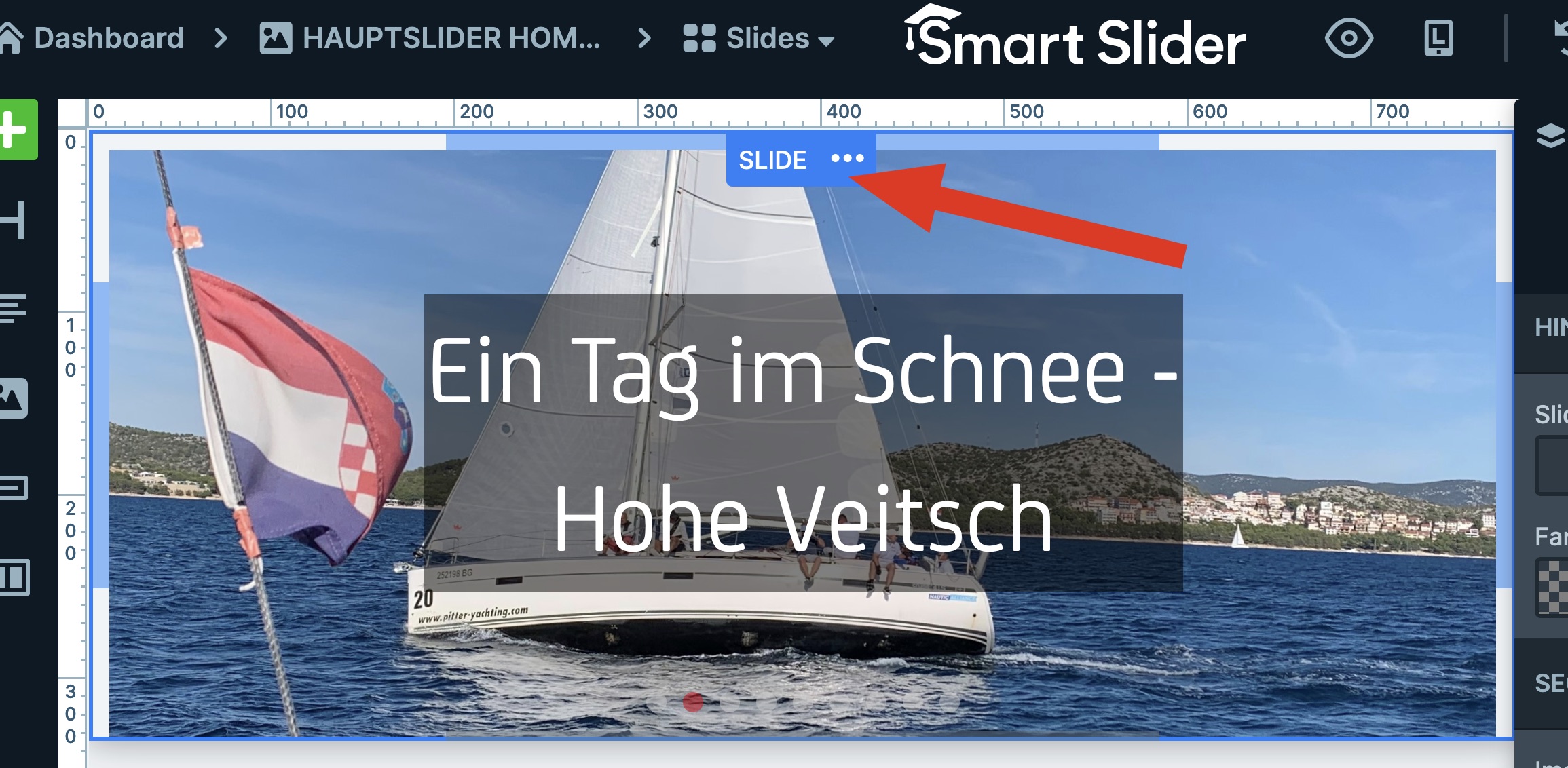—> Mit der Maus über das Slide Bild fahren und oben mittig auf ‚Slide‘ klicken, wodurch das Bearbeitungsmenu für das Slide Bild aktiviert wird