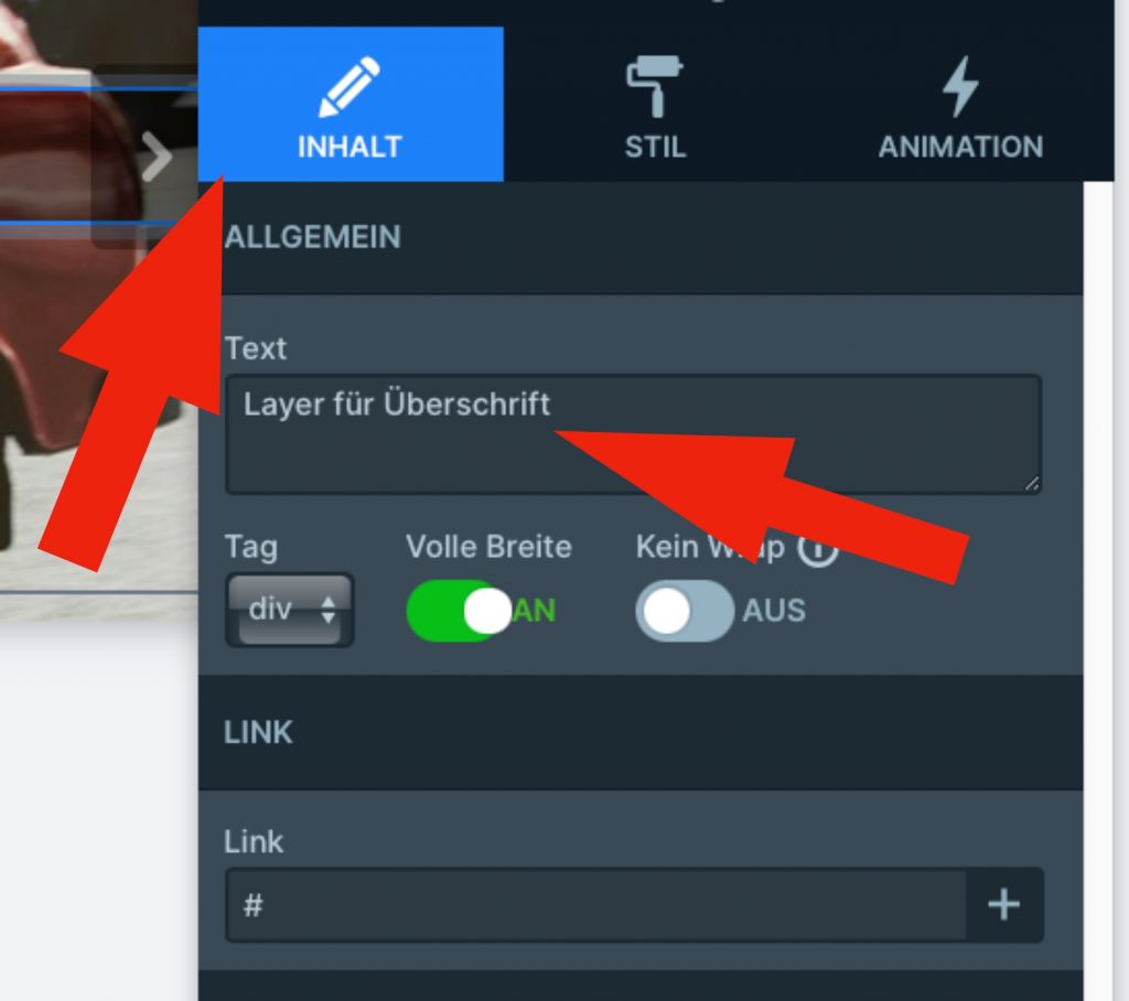 —> Nun kann der Titel selbst bearbeitet werden, indem im Bearbeitungsmenu auf ‚Inhalt‘ geklickt und dort im Feld ‚Text‘ der gewünschte Titel eingegeben wird