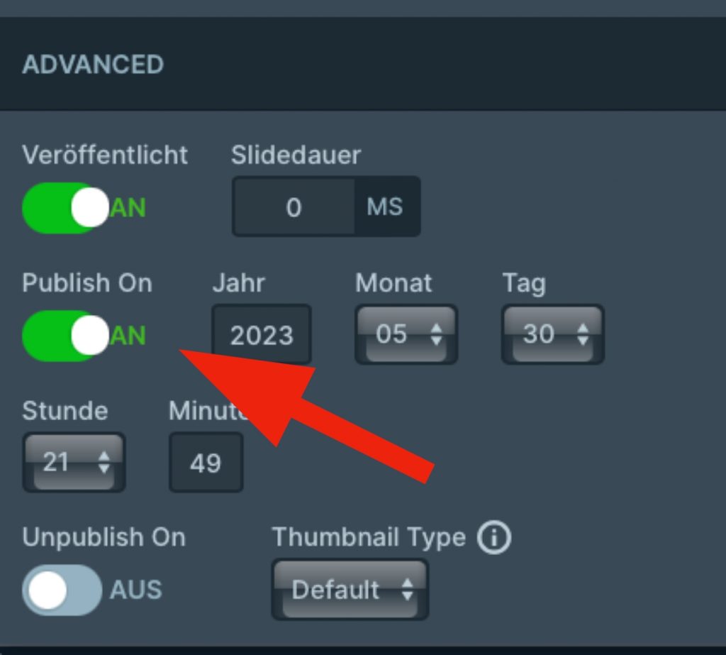 —> Schieberegler ‚Publish On‘ samt Datumseinstellung sorgt auf Position ‚An‘ für termingesteuerte Veröffentlichung. Datum und Tageszeit können dort eingestellt werden.