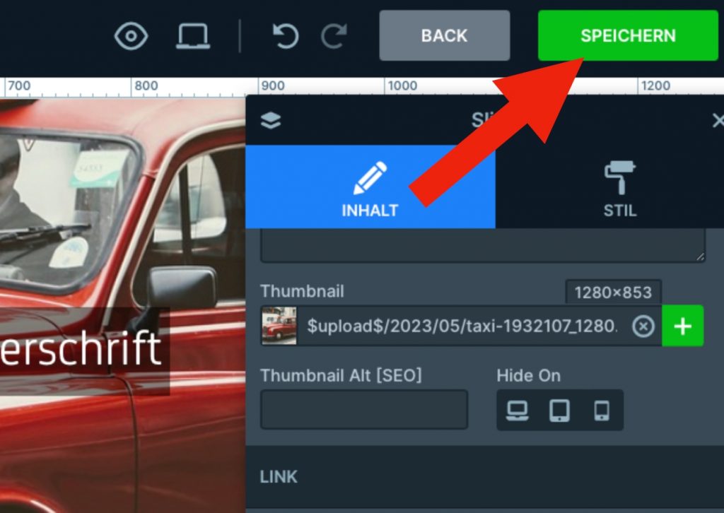 —> Schieberegler ‚Veröffentlicht‘ auf ‚An‘ stellt die Slide grundsätzlich online, wobei ein tatsächliches Online erst bei Klick auf ‚Speichern‘ erfolgt